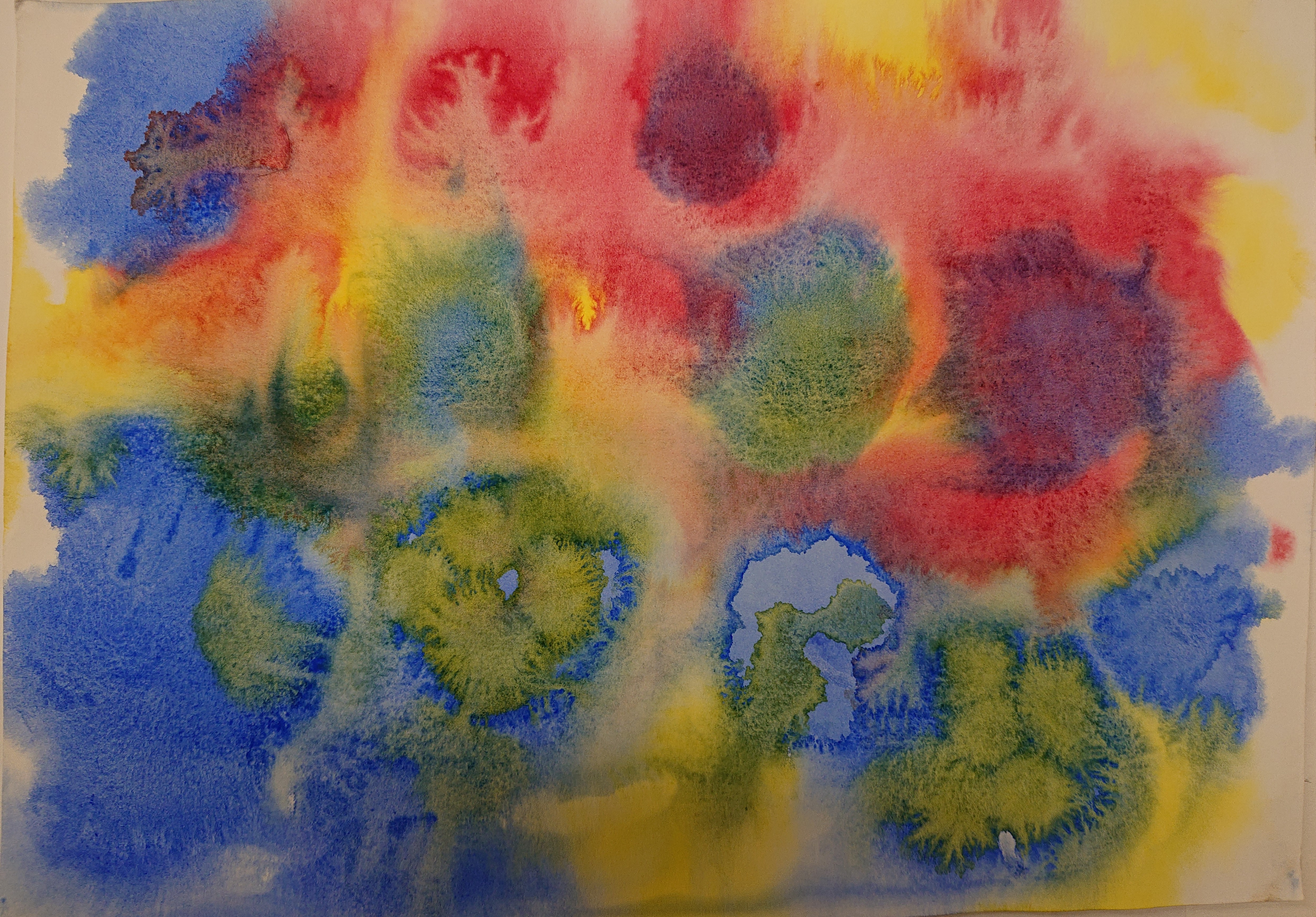 そして幻想的な青、黄、赤の互いに浸透し流れる夢のような「にじみ絵」の美・・・。子どもの絵画は「直接の生命」に溢れています。